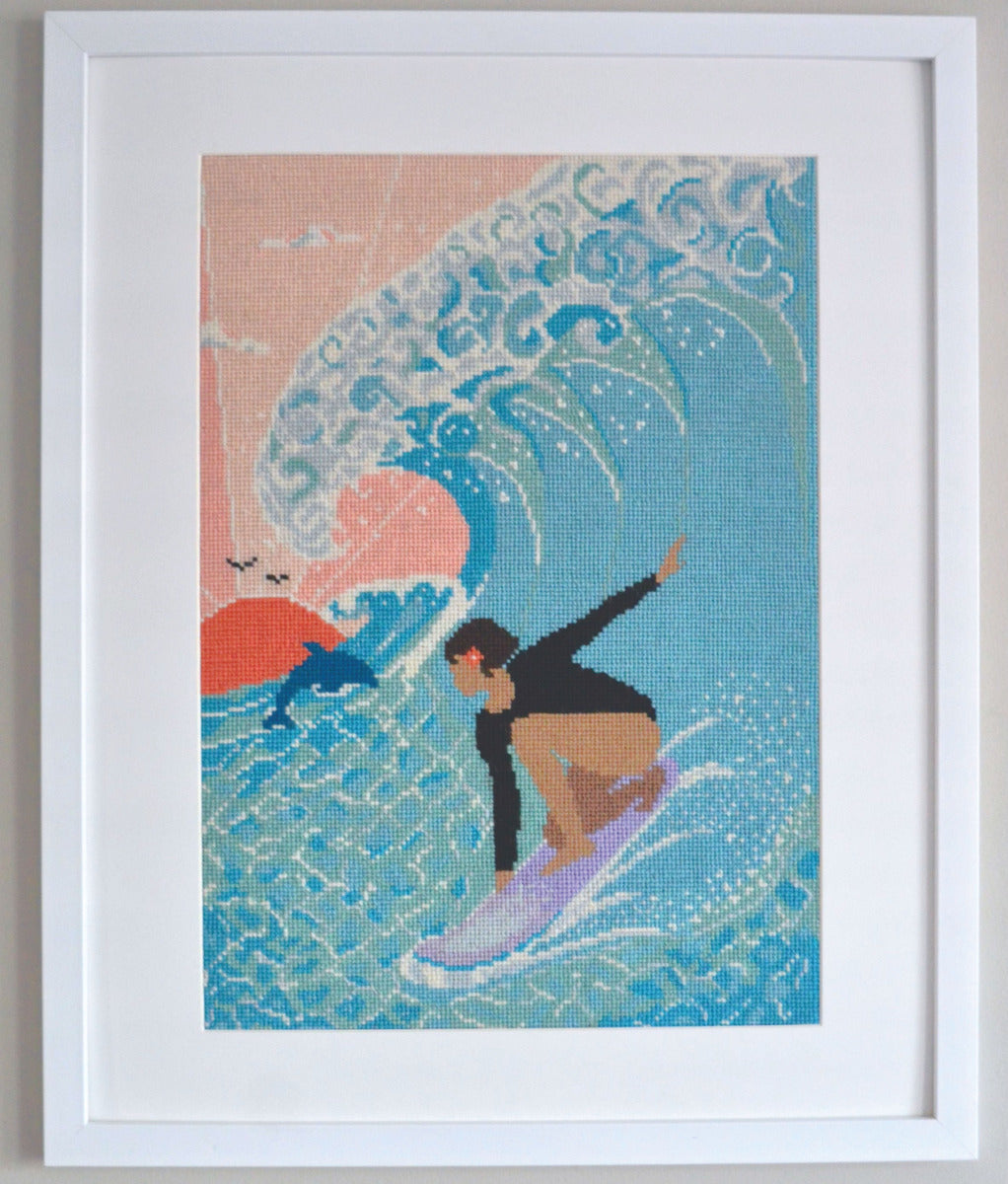 Ride the wave of creativity with Sunset Surfer, a vibrant needlepoint design that captures the thrill and beauty of surfing at golden hour. Against a backdrop of warm pink skies and a glowing sun sinking toward the horizon, a graceful surfer carves across a foamy turquoise wave, joined by a playful dolphin in the distance. Inspired by the dynamic curves of ocean swells and the tranquil joy of a seaside evening, this kit combines bold colors with flowing movement to make a stunning finished piece. Perfect for ocean lovers, surfers, and anyone who wants a splash of coastal charm in their home décor.